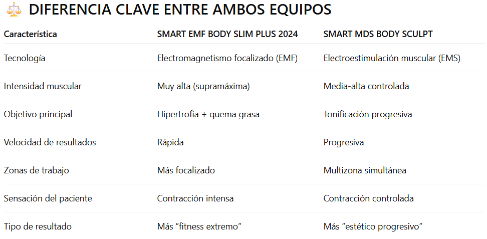 Aunque tanto el SMART EMF BODY SLIM PLUS 2024 como el SMART MDS BODY SCULPT buscan mejorar la silueta, lo hacen desde mecanismos fisiológicos totalmente distintos.